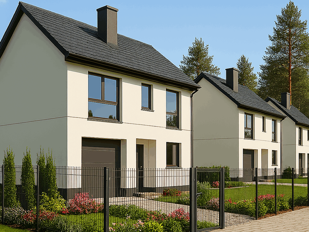 Układ domów zaprojektowano z myślą o komforcie mieszkańców – każdy budynek posiada wydzieloną działkę, a dojazd zapewnia wewnętrzna droga osiedlowa.